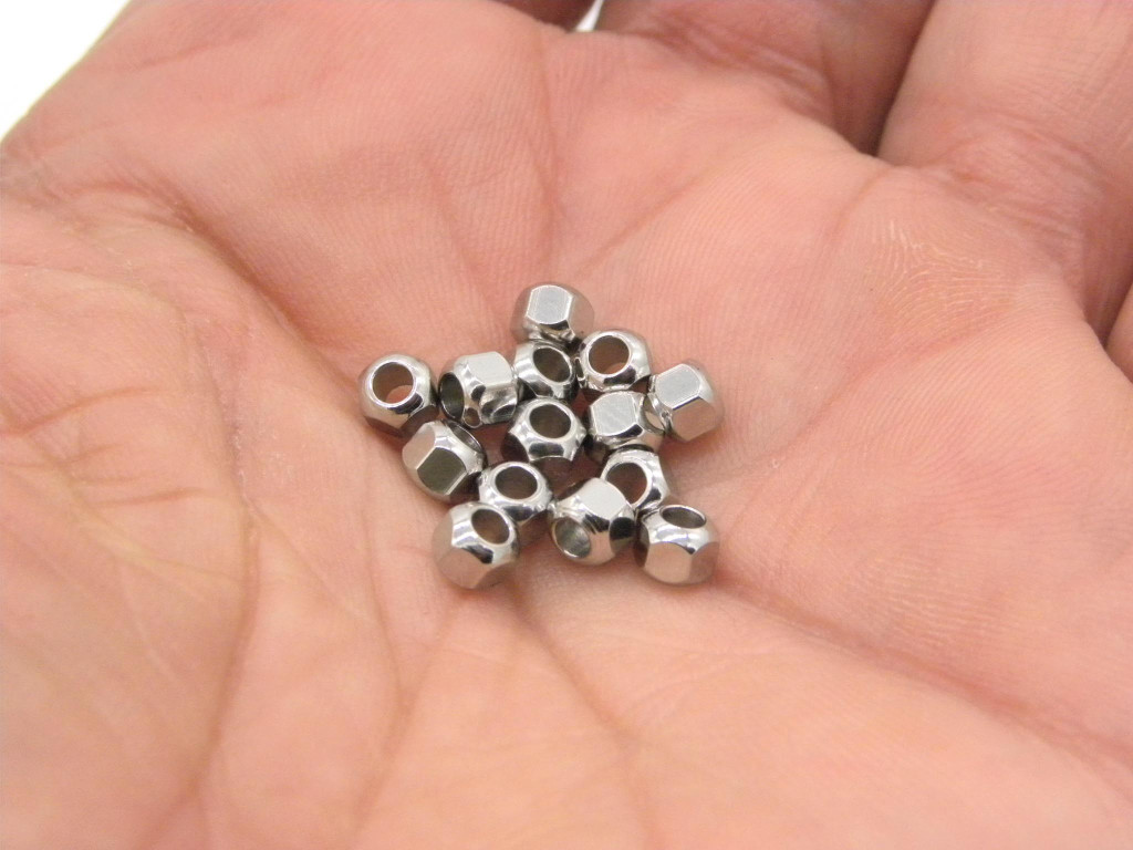 4 mm Small Faceted Nut-Shaped Solid Stainless Steel Beads - 1.5 mm Hole - Silver Tone (10 Pc.)