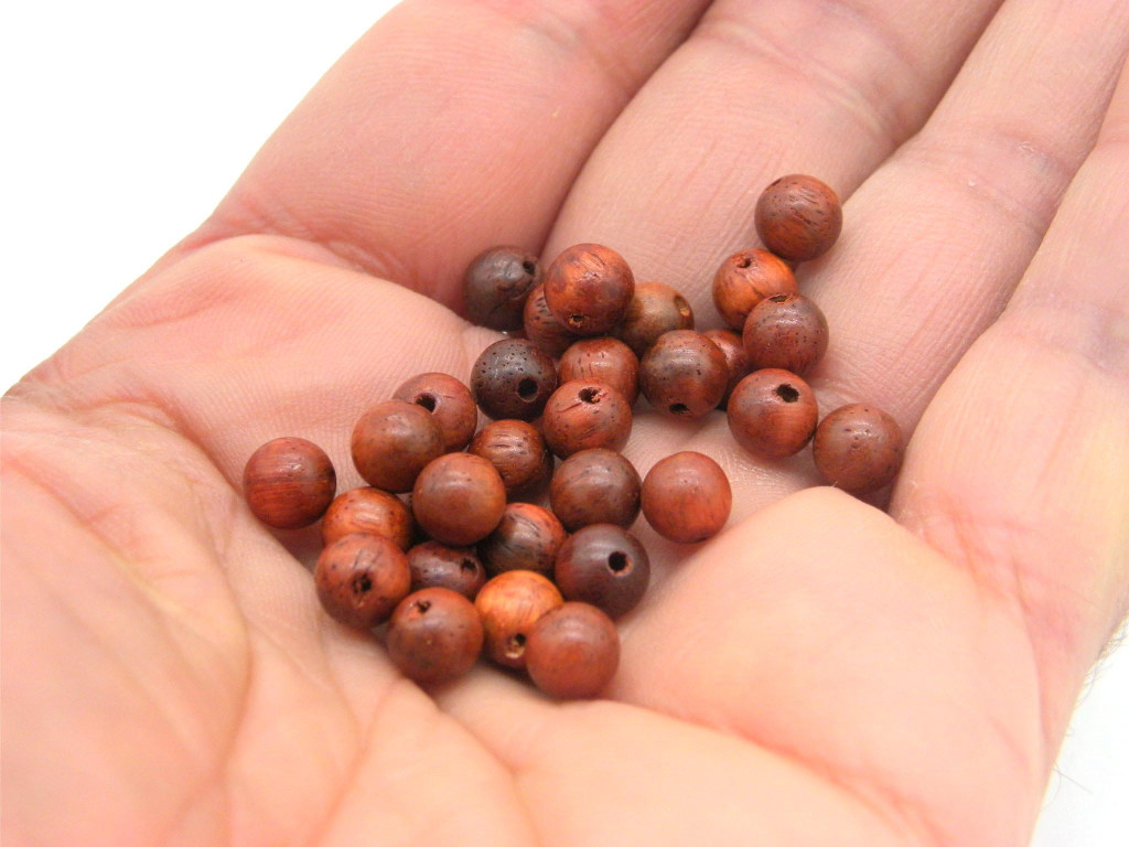 These lovely brown wood beads are waxed and polished without the use of harmful chemicals. The quality beads are round and uniform with precise bead holes. It could be the case that the holes get plugged by small wooden chips from the process. In this case just use a fine pin or needle to push out the wooden chips from the holes. These small brown wooden beads are light and perfect for quality hand-made jewellery, such as bracelets and earrings.