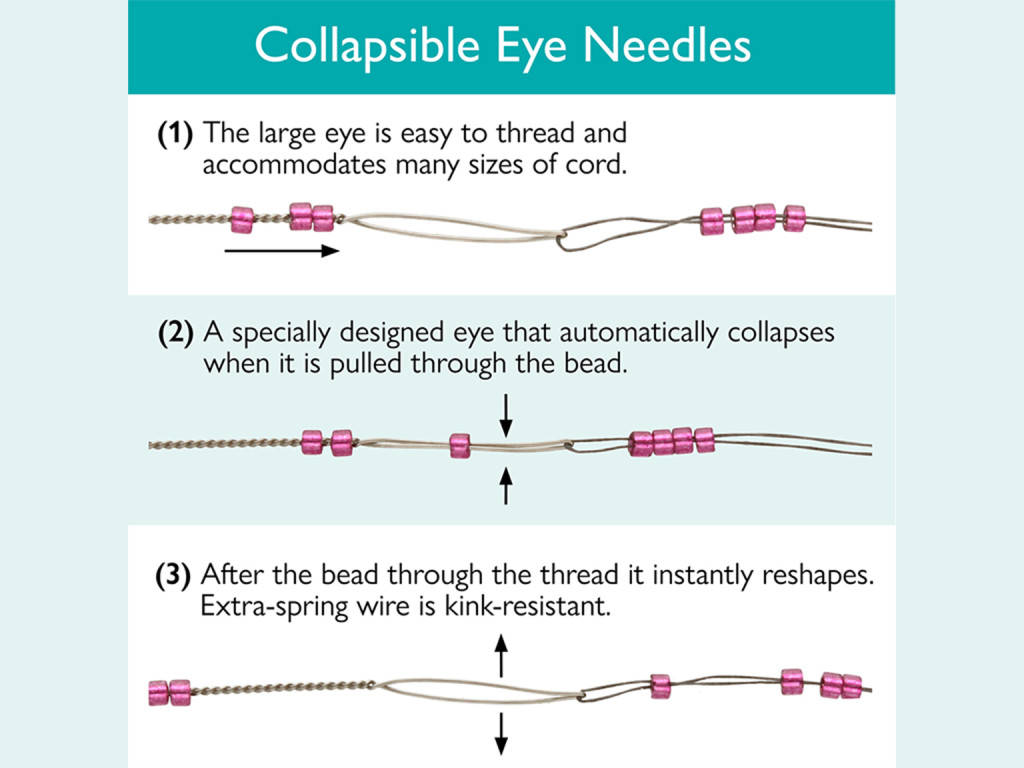 These needles are flexible and do not break. The needle eye is wide, allowing you to pass thread and cord with ease. It collapses when you pass the needle through beads and then it opens again. Not suitable for stitching clothing.