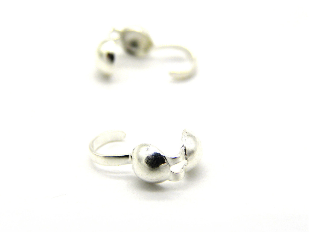 Silber Kalotten sind einfache Bestandteile, die Knoten und Krimp-perlen in Halsketten und Armbändern verbergen helfen. Einfach das Fadenende durch das Loch der Kalotte (von außen) führen, verknoten oder mit einer Crimpperle abschließen, die Callotte schließen und das lange Ende um einen Sprungring (oder eine Schließe) falten.